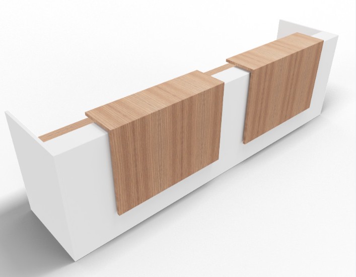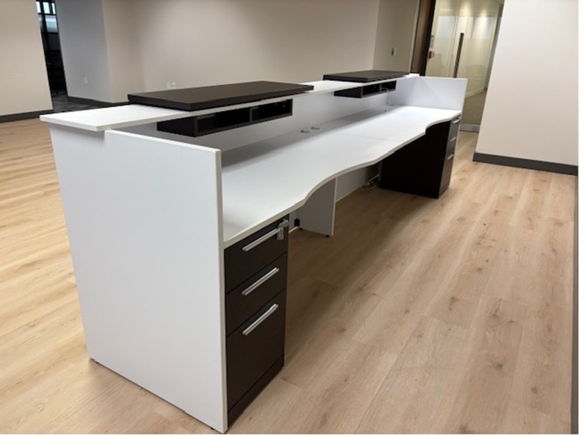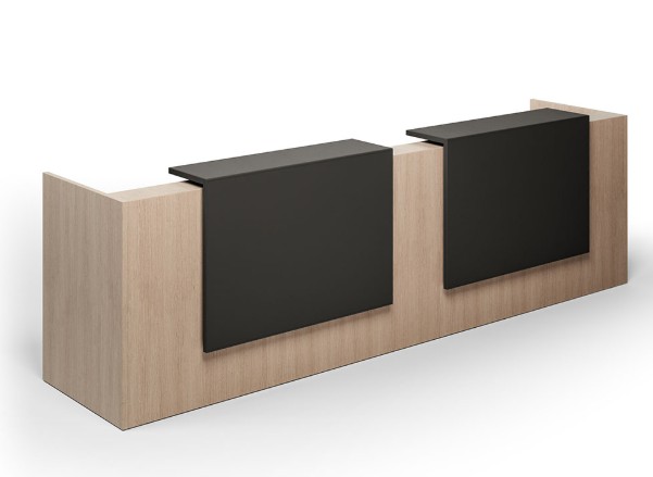 The reception desk for two is made from high-quality laminate with 3mm PVC edge banding to protect the corners from daily wear and tear. It features integrated grommets for cable management, adjustable leveling glides for stability, and each front overlay includes two pigeonhole compartments with adjustable LED lighting.