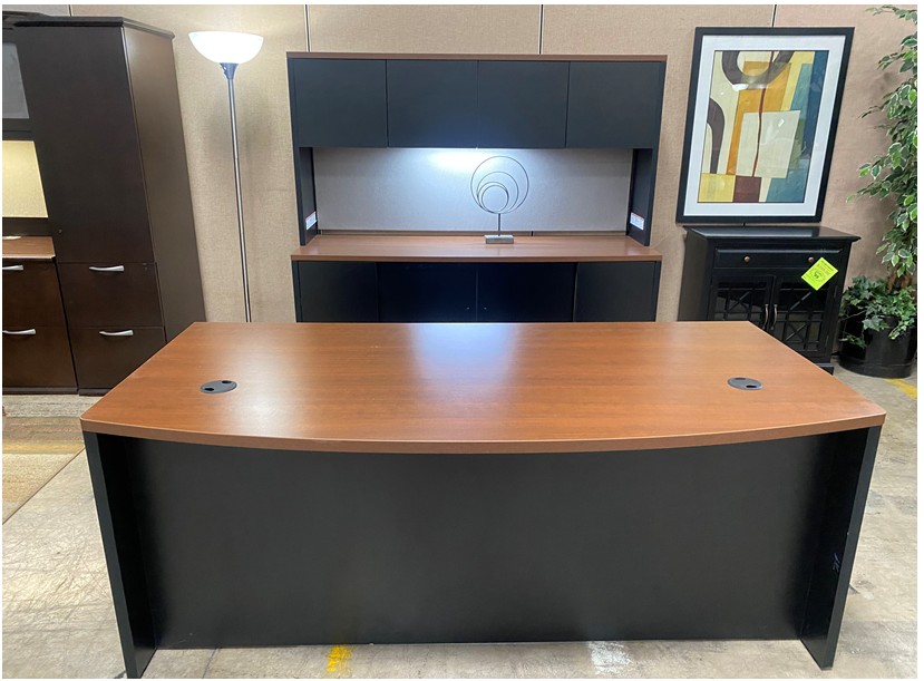Cherry and Gray laminate, Bowfront Desk, 36×72. Task light and Tackboard included