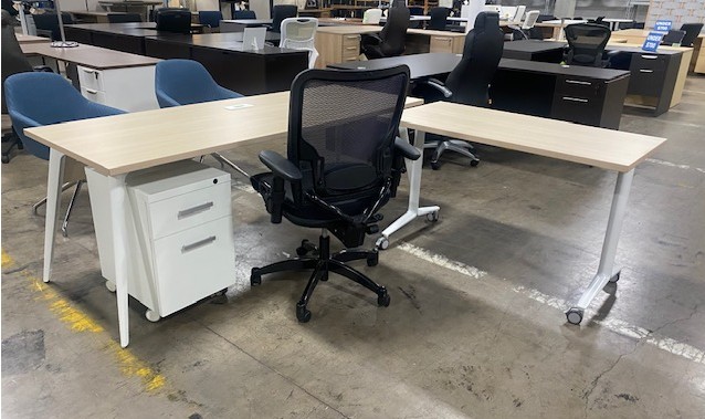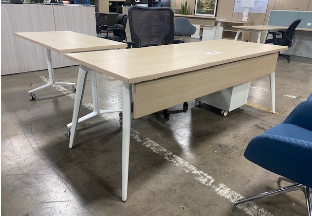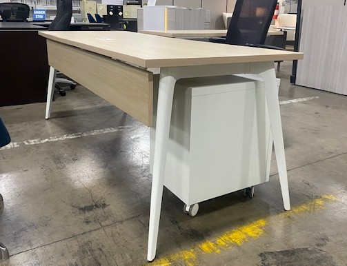 $547 -Main table desk,78×30 includes white mobile file, white metal oblique legs and modesty panel. Blond light finish top