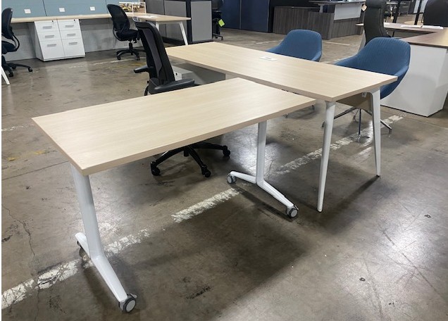 -Side table on wheels, 48×24, Blond light finish top with white metal legs, on locking wheels.